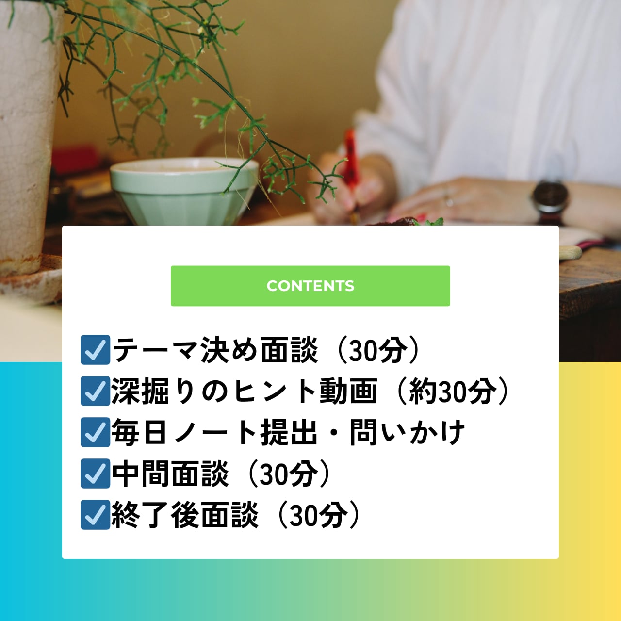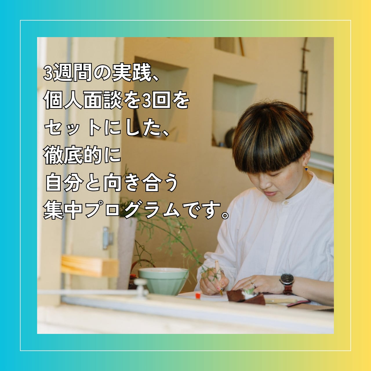3週間の実践、そして30分の個人面談を3回セットにした、徹底的に自分と向き合う集中プログラムです。